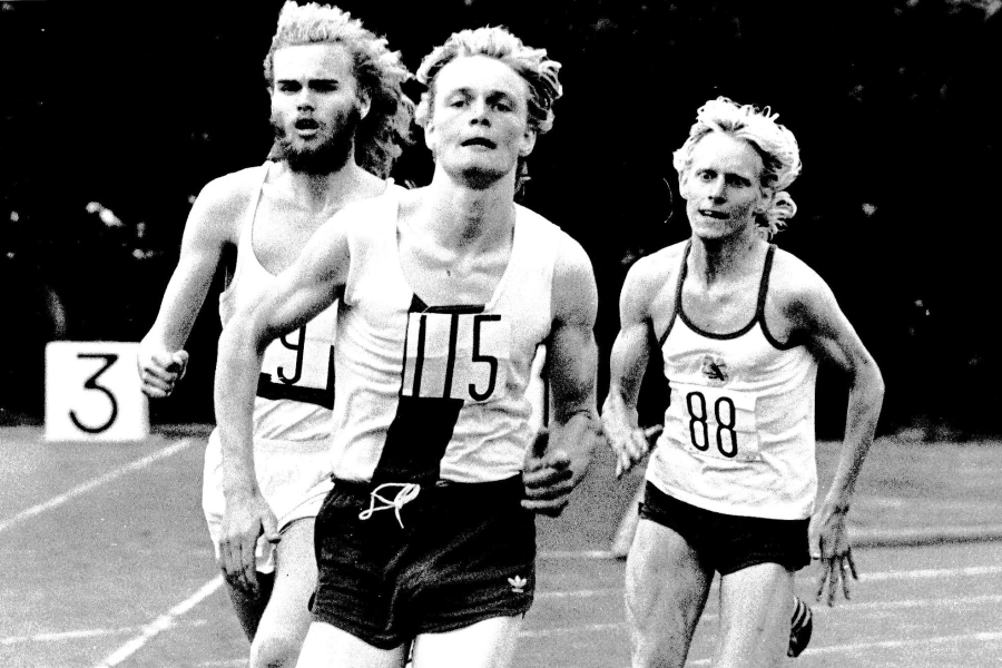 1975. John op weg naar de titel op de 1500 meter tijdens de Noordelijke kampioenschappen in Heereveen.